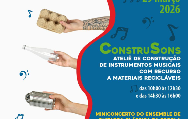 O Auditório da Junta de Freguesia de Cercal do Alentejo recebe, este domingo, um ateliê de construção de Instrumentos Musicais com materiais recicláveis, com duas sessões, das 10:00 às 12:30, e das 14:30 às 16:00 .