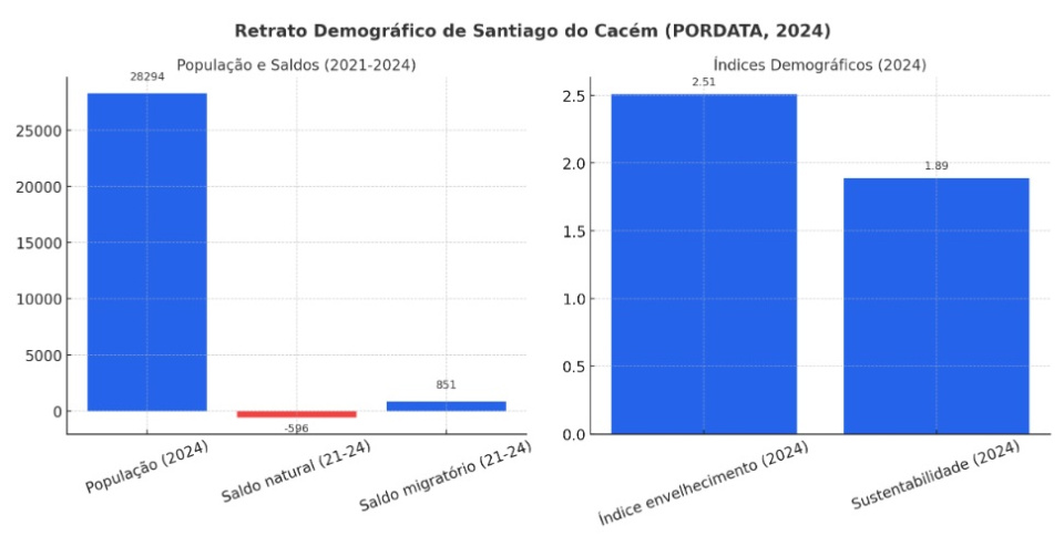 De acordo com dados divulgados, o concelho de Santiago do Cacém apresentou um saldo migratório de +851 pessoas, suficiente para superar o saldo natural negativo de –596, consequência de uma natalidade baixa e de uma mortalidade ainda elevada.